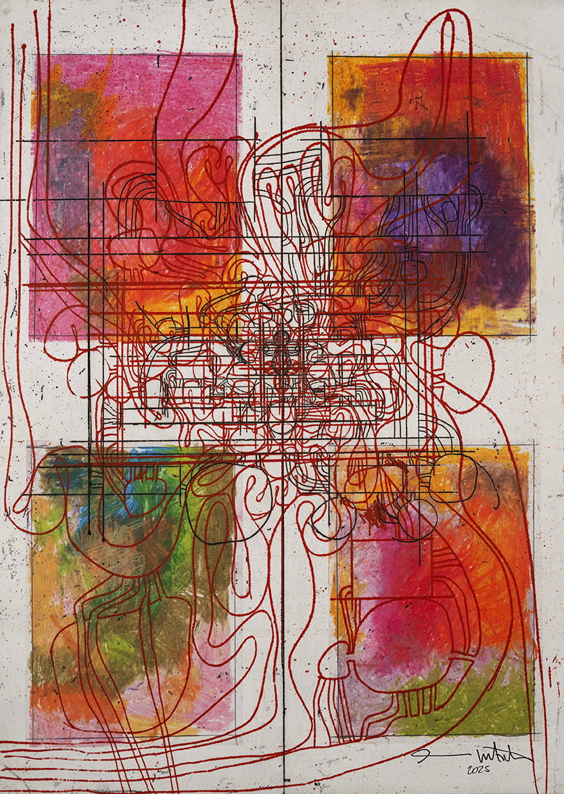 It was printed at the world-renowned Zein Editions in Vienna and shows a drawing by Hermann Nitsch on fine art print, overlaid with line etchings (original printing plates from 1998) by Hermann Nitsch.
